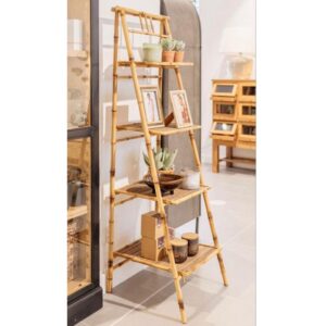 Rak bambu dapat ditempatkan di ruang tamu untuk menyimpan buku, majalah, hiasan, dan tanaman indoor. Dengan desain terbuka, rak ini tidak memblokir cahaya, sehingga ruangan tetap terang dan terasa lebih luas. Tambahkan keranjang anyaman atau kotak penyimpanan di beberapa bagian untuk barang-barang kecil agar tetap rapi.